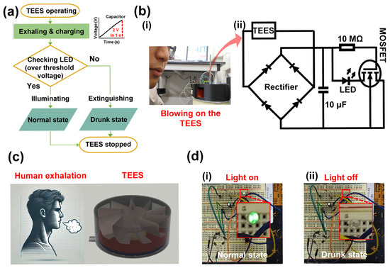 Application of TEES as a self-powered ethanol sensor: (a) flow chart of self-powered ethanol sensing; (b) (i) digital photograph of test and (ii) circuit diagram for TEES system; (c) schematic diagram of implementation for TEES with exhalation to detect human drunk state; (d) circuit set up images on the breadboard and confirmation of illuminating an LED.