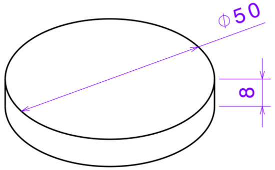 A CAD model, depicted in Figure 1, was designed for the printing experiment. The specimen is a cylindrical structure with a diameter of 50 mm and a height of 8 mm, which meets the fixture requirements of the Anton Paar TRB3 tribometer (Anton Paar (Shanghai) Trading Co., Ltd., Shanghai, China) used in friction testing. It was modelled using UGNX v41.0 software.