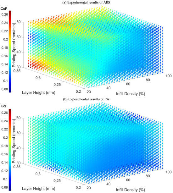 Experimental results of (a) ABS. (b) PA. The colour scale represents the CoF.