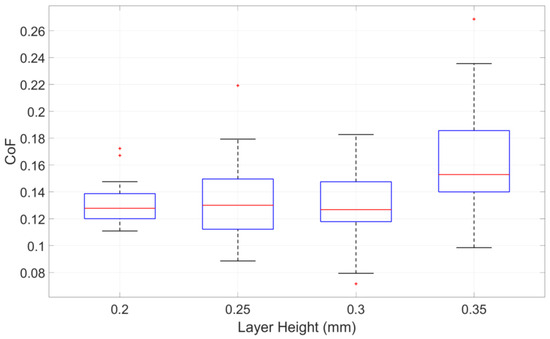To quantitatively analyse the effect of layer height on the CoF, the average values of all experimental data for each fixed layer height are summarized in Table 2. The boxplot for the average CoF of different layer heights is shown in Figure 4.