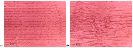 To further investigate the relationship between layer height and surface quality, a Dino-Lite AM4113T digital optical microscopy was employed to observe the surface morphology of selected specimens. As illustrated in Figure 5, the images reveal that specimens printed at a layer height of 0.35 mm exhibit more pronounced surface irregularities compared to the sample printed at a 0.2 mm layer height. The nozzle may not sufficiently compress the extruded material at larger layer heights, resulting in decreased surface quality and void formation. This factor contributes to poorer surface uniformity and higher measured CoF values.