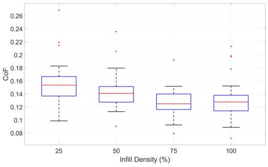 The data for all specimens with the same infill density were averaged, and the corresponding results are summarized in Table 3. To further illustrate the distribution and variability of the CoF across different infill densities, a boxplot representation is provided in Figure 6.
