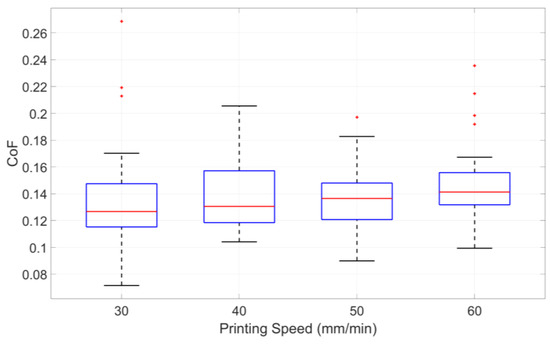 The experimental data corresponding to each print speed were averaged to evaluate the influence of print speed on the CoF, with the results presented in Table 4. Additionally, the variability and distribution of CoF values across different print speeds are visually depicted in the boxplot shown in Figure 7.