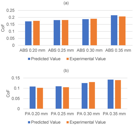 Validation experiment CoF results for (a) ABS, and (b) PA.