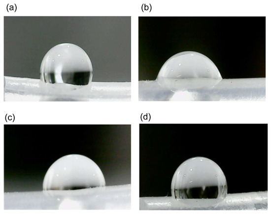 Sequential modifications of the PDMS surface illustrated by water contact angle measurements. (a) Baseline. The unmodified PDMS surface shows the original water contact angle. (b) Activation. The surface post-HCl treatment demonstrates a reduced contact angle due to the formation of silanol (Si-OH) groups. (c) Pegylation. After the incorporation of PEG-Silane, the contact angle slightly increases due to the presence of hydrocarbon chains. (d) Functionalization. in the final stage, with copper nanoparticles (CuNPs) embedded, the contact angle slightly increases further, indicating successful immobilization and stabilization of CuNPs on the hydrophobic surface.