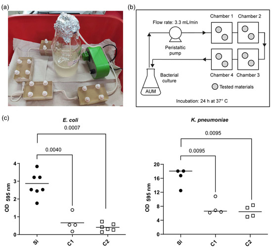 Quantitative analysis of biofilm formation on the COPESIL® and control films. (a) Experimental setup showing the continuous flow system used for the biofilm formation assay. (b) Schematic drawing of the continuous flow system developed, indicating the flow of artificial urine medium (AUM) through chambers containing the tested materials, with the flow rate set at 3.3 mL/min and an incubation period of 24 h at 37 °C. (c) Optical density measurements at 595 nm (OD595) displaying the extent of biofilm formation by E. coli (left) and K. pneumoniae (right) on various film surfaces after 24 h. The tested films include silicone control films (Si), COPESIL®-1 films (C1), and COPESIL®-2 films (C2). The data points represent individual measurements, and the horizontal lines indicate the median values. For E. coli, biofilms formed significantly less on both COPESIL® films than the silicone control. Similarly, biofilm formation by K. pneumoniae was significantly lower on COPESIL® films. Statistical analysis using the Mann–Whitney test shows significant differences, with P-values indicated above the brackets to highlight comparisons between different film types.