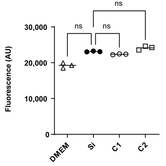 Cytotoxicity assessment in HepG2 cells using resorufin fluorescence. Fluorescence measurements of resorufin, indicative of cellular metabolic activity, are shown for HepG2 cells exposed to different conditions. The fluorescence intensities, measured in arbitrary units (AUs), are shown for cells incubated in DMEM (control) and cells exposed to media conditioned with silicone control films (Si), COPESIL®-1 films (C1), and COPESIL®-2 films (C2). The data points denote mean fluorescence values obtained from triplicate experiments. The Mann–Whitney test was applied to analyze statistically significant differences. ns = not significant.