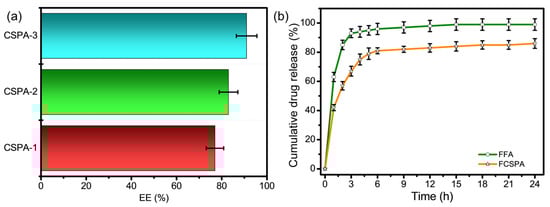| Drug | Polymer Matrix | EE (%) | Release Duration (h) | Bioactivity | Ref. |