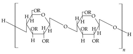 Cellulose ethers (Figure 1) are derivatives of cellulose with the general chemical formula [C6H7O2(OH)3−x(OR)x]n, where X shows the number of hydroxyl groups that have been substituted in the cellulose macromolecule, while R represents an alkyl, acyl, or mineral acid residue. Methylcellulose, hydroxypropyl cellulose, and hydroxyethyl cellulose belong to cellulose ethers.