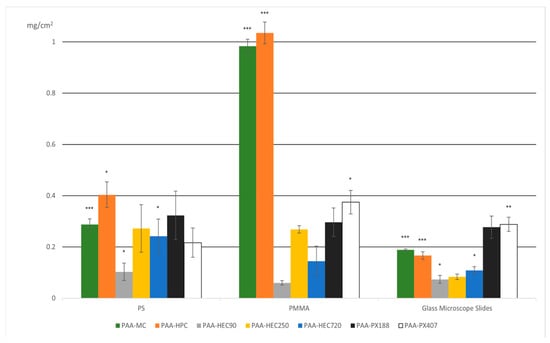 Surface density of interpolymer complex (IPC) films (mg/cm2) formed on various substrates (PS, PMMA, and glass microscope slides) using different polymer pairings. The bars represent the mean values of surface density for each IPC composition (e.g., PAA–MC, PAA–HPC, PAA–HEC variants, PAA–PX188, and PAA–PX407), with error bars indicating standard deviation. Statistical significance is indicated relative to a designated control (IPC film formed on glass), with p-values as follows: *** p < 0.001, ** p = 0.001–0.01, * p = 0.01–0.05, and none = not significant (p ≥ 0.05). These results highlight substrate-dependent differences in film formation efficiency, with PAA–MC and PAA–HEC250 exhibiting the highest deposition on PMMA.