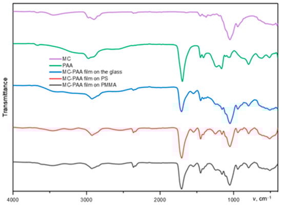 The results of the conducted IR spectroscopic studies show that the IR spectra of the obtained interpolymer complexes show prominent, broad, and well-defined peaks in the region of 1700~1800 cm−1, which can be attributed to the formation of hydrogen bonds in the initial polymers in the IPC films.