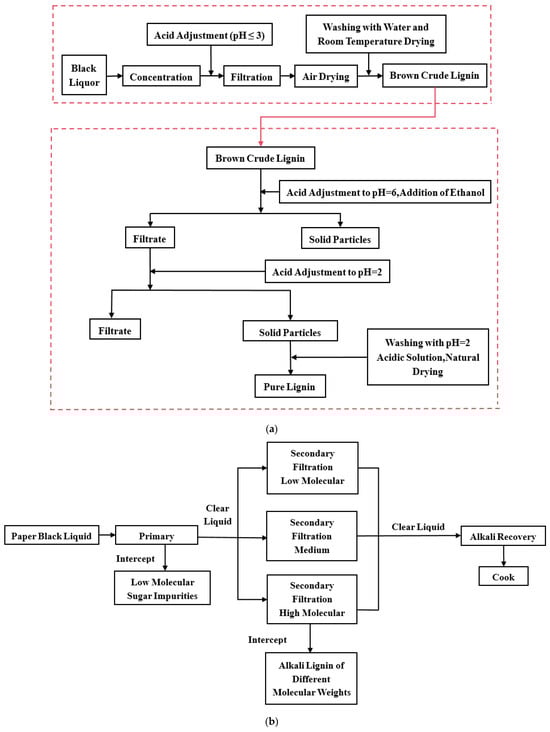 (a) Process flowchart for lignin extraction using acid precipitation; (b) a schematic of a typical two-stage ultrafiltration membrane separation system.