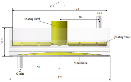 Figure 2 presents a plan view of the blade-type dynamic cross-flow filtration module fabricated from 304 stainless steel. The filtration chamber has an internal diameter of 128 mm, while the impeller situated immediately beneath the drive shaft measures 122 mm in diameter. Feed and permeate ports are directly integrated into the chamber to introduce black liquor and withdraw the clarified permeate; both ports are deliberately elongated to suppress back-flow. A membrane with an effective area of 3.2 × 10⁻3 m2 is mounted on the chamber floor and serves as the separation medium.