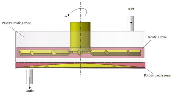 The fluid domain was subdivided into three zones (Figure 5): (i) a rotating reference frame surrounding the impeller, (ii) a porous-medium region representing the membrane, and (iii) a stationary region occupying the remainder of the volume. Owing to the complex blade geometry and steep local velocity gradients, the mesh in the rotating zone was locally refined. A mesh-independence study based on velocity-gradient profiles showed that further refinement altered the results by less than 3%, confirming grid convergence.