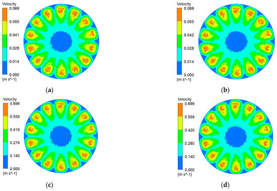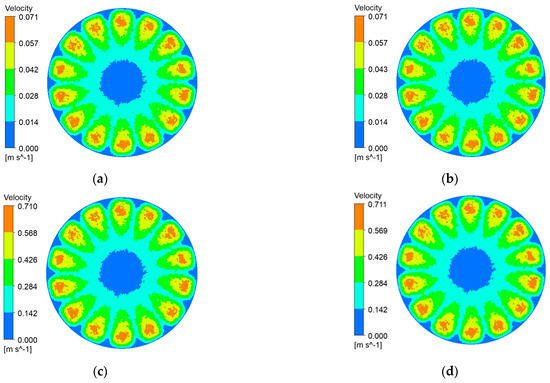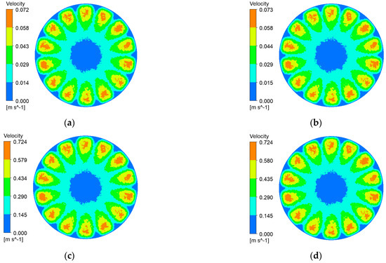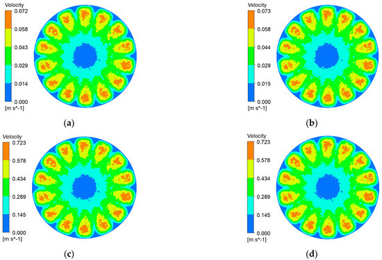 Membrane-surface velocity contours for the hybrid coarse–fine radial-rib membrane at various impeller speeds and trans-membrane pressure differences. (a) r = 100 r/min, P = 0.5 bar; (b) r = 100 r/min, P = 2 bar; (c) r = 1000 r/min, P = 0.5 bar; (d) r = 1000 r/min, P = 2 bar.