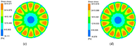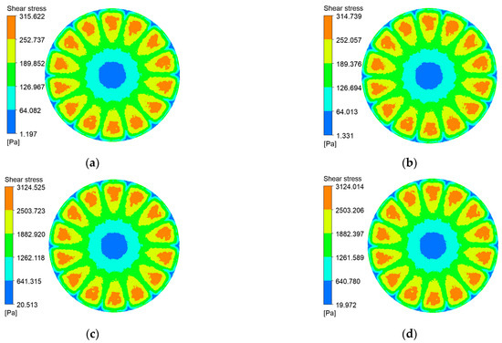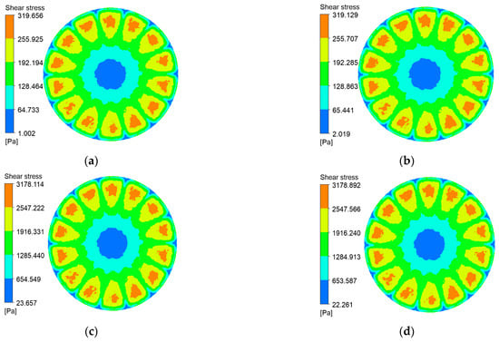 Shear stress contours on the hybrid coarse–fine radial-rib membrane surface at various impeller speeds and trans-membrane pressure differentials. (a) r = 100 r/min, P = 0.5 bar; (b) r = 100 r/min, P = 2 bar; (c) r = 1000 r/min, P = 0.5 bar; (d) r = 1000 r/min, P = 2 bar.