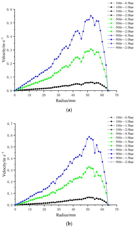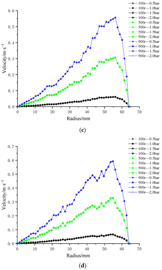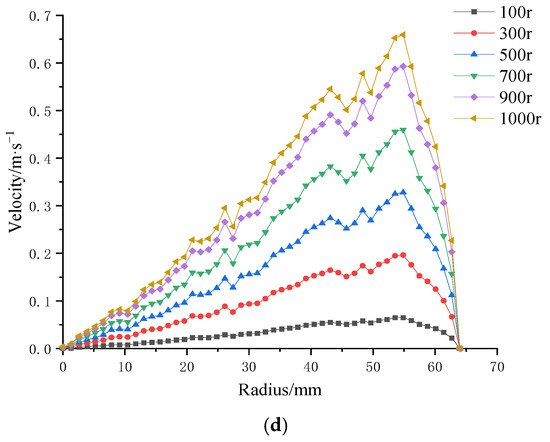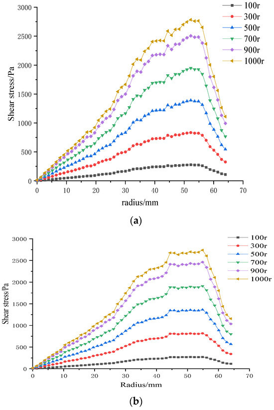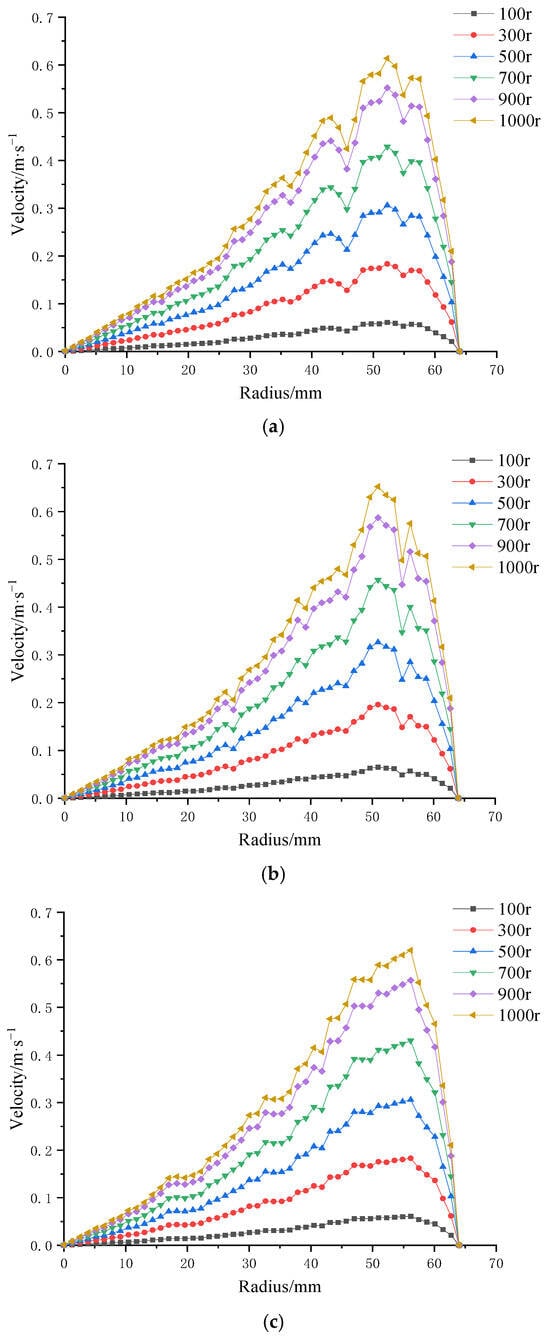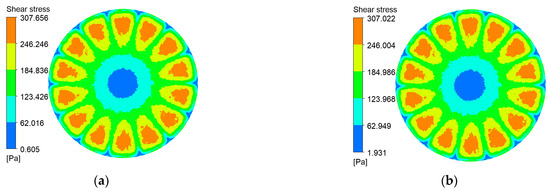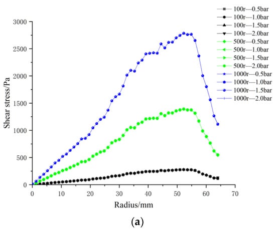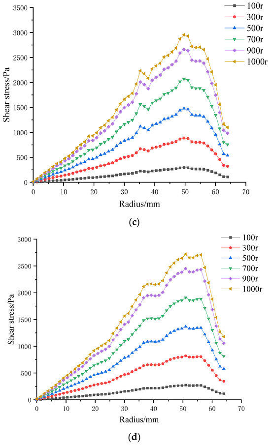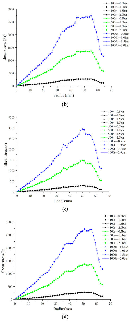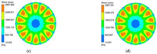 The results demonstrate that, for all four membrane patterns, shear rate increases progressively with rising impeller speed. Additionally, shear rate generally increases along the membrane radius. Notably, the membrane with the combined coarse–fine rib pattern (Figure 15c) exhibited a more stable and consistent increase in shear rate with radial distance, without the local decreases observed in the other three patterns. In contrast, the remaining membrane designs showed multiple fluctuations, characterized by alternating decreases and increases in shear rate along the radius.