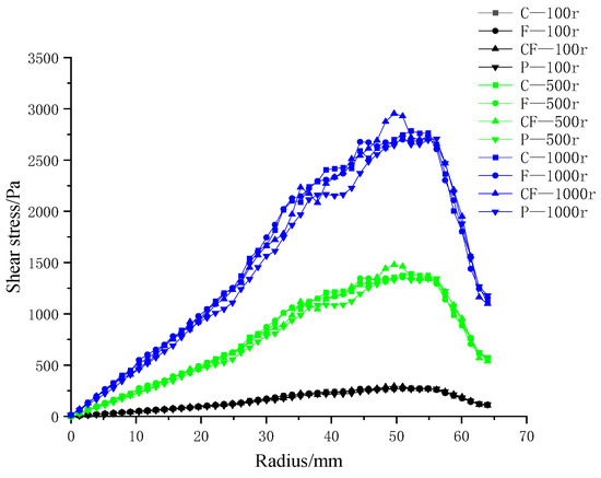 This section evaluates the shear-stress field generated on four ceramic membranes. Figure 18 presents the radial distributions at impeller speeds of 100, 500, and 1000 rpm.