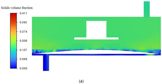 Section 3.1 and Section 3.2 present contour maps of surface shear stress and shear velocity for trans-membrane pressure (TMP) differentials of 0.5 bar and 2.0 bar and impeller speeds from 100 to 1000 rpm. The data show that the hybrid coarse–fine rib ceramic membrane operated at 0.5 bar and 1000 rpm delivers the most advantageous combination of surface shear velocity and shear stress. Guided by this finding, a dedicated CFD simulation was performed to track lignin particle deposition on the hybrid membrane during black-liquor filtration (Figure 19). Particle concentration contours are shown at 2, 20, and 40 s; by 40 s, lignin particles occupy roughly 27 % of the chamber volume relative to their initial content in the feed.