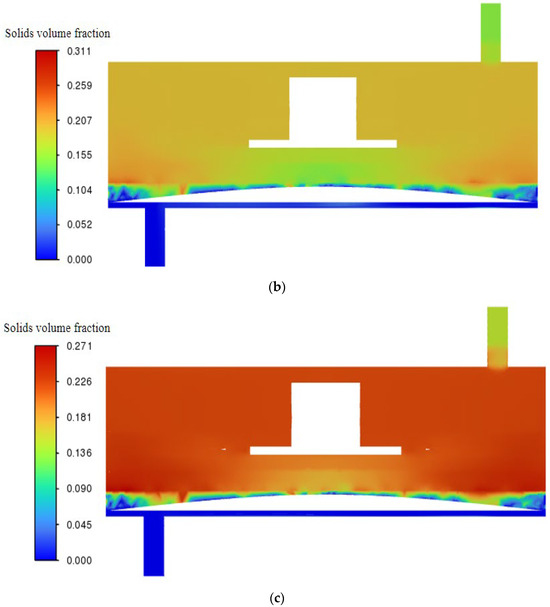 Particle deposition contours for the hybrid coarse–fine radial-rib ceramic membrane at a trans-membrane pressure of 0.5 bar and an impeller speed of 1000 rpm: (a) 2 s; (b) 20 s; (c) 40 s.