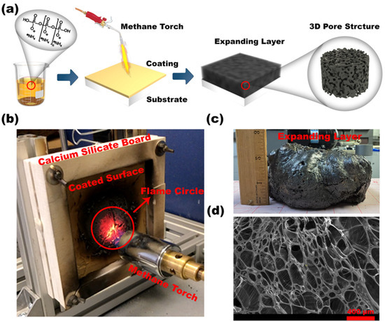 (a) Schematic of RSI coating exposure to flame and 3D pore formation; (b) real setup for methane torch flame test; (c) expanded char layer photograph; and (d) SEM of pore structure.