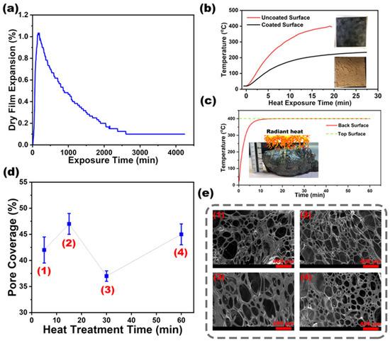 (a) Time-dependent expansion behavior of RSI coating under thermal exposure; (b) impact of passive fire protection on substrate temperature under direct flame exposure; (c) intumescent coating efficiency: delaying heat penetration to steel substrate; (d) porosity variation during heat exposure; (e) microstructural integrity of expanded RSI coating: voids, matrix, and fire-induced char morphology.