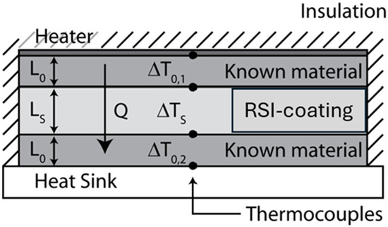 To accurately determine the thermal conductivity of the RSI coating (i.e., the thermal conductivity of the coating matrix), we used a heat flow meter setup according to a method described by [16]. The setup relied on a 1D steady-state conduction model in which the RSI coating sample was sandwiched between two reference materials with known thermal conductivity. A controlled heat source (electrical resistance heater) was applied to the upper reference material to provide consistent thermal input, and the lower reference material was placed in direct contact with a metallic heat sink at ambient temperature. This configuration ensured a stable, unidirectional heat flow and a steady-state thermal gradient across the test stack, which is essential for applying Fourier’s law to accurately measure thermal conductivity.