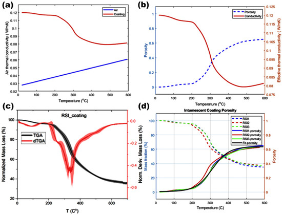 (a) Air and coating thermal conductivity in intumescent coatings across temperature range; (b) evaluating temperature-induced changes in porosity and thermal conductivity of intumescent coatings; (c) mass loss and rate of mass loss (dTGA) of the RSI coating; (d) influence of fire exposure on porosity development and mass reduction in RSI coatings with curve fitting. Note: the maximum value of porosity in Equation (7) is 62%.