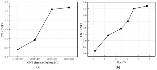 - Statistical studies on the conductivity Λ of the composites constructed with different aspect ratios of CNTs and different doping amounts of CNT systems in the static state were carried out, respectively, to analyze the effects of the aspect ratio and doping amount of CNTs on the conductivity Λ of the composites. The dispersion state of the conductive network inside the composites was also investigated quantitatively based on five parameters of conductive fillers’ radial distribution function (RDF), the maximum cluster size (Cn), the total number of clusters (Nc), the coordination number (CN), and the distribution probability (PN). The interaction energy between the conductive filler and the polymer matrix was calculated, and the variations in the interaction energy with the parameters of the conductive filler were analyzed as well as the correlation relationship between the interaction energy, the conductivity and the dispersion state, which can reveal the interaction between the micro-, nanostructure, and resin interfacial behavior and conductivity behavior.