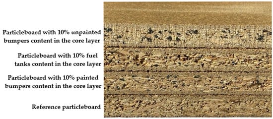 The resulting three-layer particleboards were produced with three different types of plastic fillers, including painted bumpers (PB10), unpainted bumpers (UB10), and fuel tanks (FT10) (Figure 2). Each filler type was incorporated at a content level of 10%. In addition, a three-layer particleboard without any plastic filler (P) was also produced, which serves as the reference board for comparison. The designations of all samples are provided in Table 2.