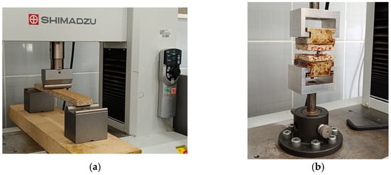 Testing of mechanical properties of particleboards: (a) three-point bending test of particleboard using a Shimadzu universal testing machine; (b) tensile strength testing of particleboard samples.