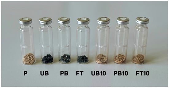 Samples of wood particles, reference particleboard, plastics, and composite boards with 10% plastic content, prepared for VOC analysis via GC-MS. Each vial contains precisely 0.5 g of the sample and is hermetically sealed with a silicone septum to ensure controlled headspace conditions: P—reference particleboard; UB—unpainted bumpers; PB—painted bumpers; FT—fuel tanks; UB10—particleboard with 10% unpainted bumpers; PB10—particleboard with 10% painted bumpers; FT10—particleboard with 10% fuel tanks.