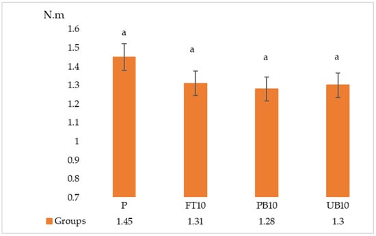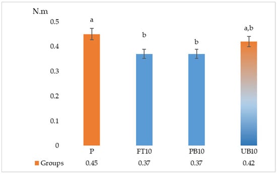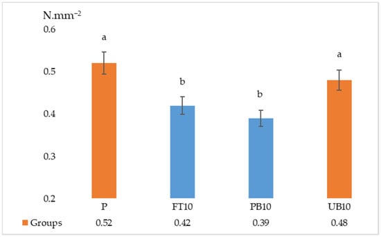 Results of stripping torque of particleboards containing plastic filler (P—reference particleboard; FT10—particleboard containing 10% waste fuel tanks; PB10—particleboard containing 10% waste painted bumpers; UB10—particleboard containing 10% waste unpainted bumpers). Note: Different letters indicate different homogeneity groups.