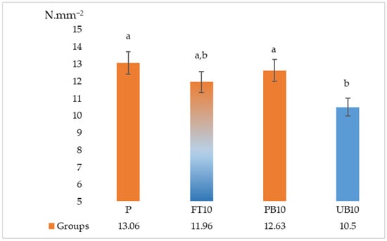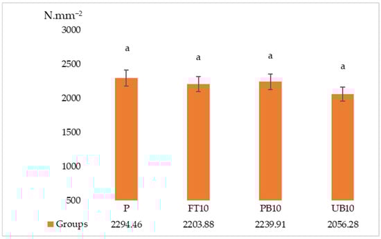 Results of modulus of rupture of particleboards containing plastic filler (P—reference particleboard; FT10—particleboard containing 10% waste fuel tanks; PB10—particleboard containing 10% waste painted bumpers; UB10—particleboard containing 10% waste unpainted bumpers). Note: Different letters indicate different homogeneity groups.