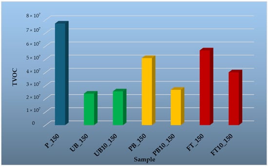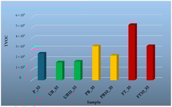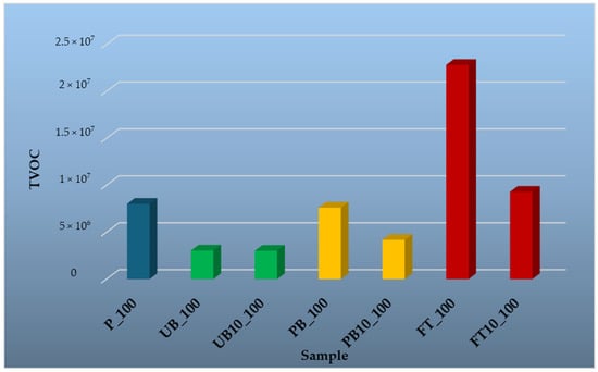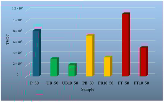 In this study, VOC emissions were analyzed from various materials relevant to composite production, three types of automotive plastics (fuel tanks, painted bumpers, and unpainted bumpers), a reference particleboard and wood–plastic composites containing 10% of these plastics in the core layer. Each sample type was analyzed once under each test condition. For better clarity, the abbreviations of the materials used are explained in Table 3.