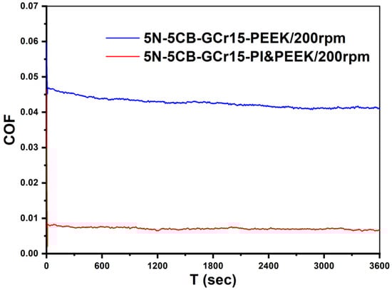 The reason for choosing 5CB as the lubricant and PI (PMDA-ODA) as the friction component in this study is that the pretilt angle between 5CB and PI (PMDA-ODA) is very small (approximately 1.0°) [34], and 5CB molecules are almost parallel to PI (PMDA-ODA) molecules. As shown in Figure 1, when 5CB was used as the lubricant, the coefficient of friction (COF) of the friction system using PI&PEEK as the lower sample was 0.007158, while the COF of the system using PEEK as the lower sample was 0.04268 under the same test conditions. The COF of the friction system using PI&PEEK was only 1/6 of that using PEEK, indicating that the COF of the friction system decreased by 83.3% after the addition of the PI film. This demonstrates that PI plays an important role in the lubrication of the friction system. PI has an excellent ability to regulate liquid crystal orientation. During friction, specific microstructures or grooves are easily formed on the PI surface, and the anchoring energy between the PI surface and the 5CB liquid crystal molecules promotes the orientation of the liquid crystal molecules along the friction direction. Since the pretilt angle between 5CB and the PI used is small (approximately 1.0°), the 5CB molecules are almost parallel to the PI surface. When the 5CB molecules are aligned in a specific direction, a stable lubricating film is formed, reducing friction and lowering the COF. Additionally, the weak intermolecular forces between the 5CB molecules and their parallel alignment maintain the high fluidity and low viscosity of the liquid crystal, further reducing the COF. Therefore, the orientation effect of PI on the liquid crystal effectively promotes superlubricity, and the COF of the system is significantly lower than that of the system using PEEK alone. In summary, the GCr15/PI&PEEK friction system can achieve superlubricity when 5CB is used as the lubricant, with PI playing a key role in lubrication and PEEK providing support with its excellent toughness and impact resistance, maintaining the stability of the friction system.