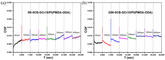 Friction coefficients as a function of time using 5CB as the lubricant and GCr15/PT&PEKK as the friction pair with different speeds. (a) COF curves under a 5 N load; (b) COF curves under a 25 N load.