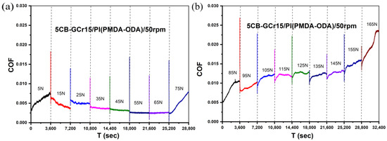 COF as a function of time using 5CB as the lubricant and GCr15/PT&PEKK as the friction pair with different loads at 50 rpm. (a) COF from 5 N to 75 N; (b) COF from 85 N to 165 N.