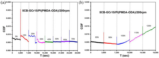 COF as a function of time using 5CB as the lubricant and GCr15/PT&PEKK as the friction pair with different loads at 200 rpm. (a) COF from 5 N to 75 N; (b) COF from 85 N to 125 N.