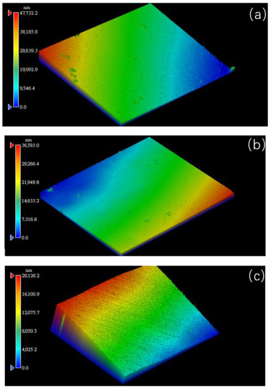The surface of the PI film before friction was imaged using a white light interferometer, as shown in Figure 6a. The PI surface was relatively smooth and uniform, with no obvious texture, indicating that it was not affected by mechanical action. Figure 6b shows the surface morphology of the PI film after dry friction. Figure 6c shows the surface morphology of the PI film after liquid crystal lubrication testing under the same conditions as in Load of 25 N Section. The surface of the PI film showed obvious grooves aligned with the friction direction, which may be related to the orientation of the molecular chains. Further analysis can be conducted using polarized light microscopy. This indicates that friction can effectively change the surface morphology of the PI film and may also alter the arrangement of the PI molecules on the surface.