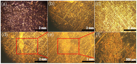 Polarized light microscopy images of the PI film. (a) Unfrictioned area of the original PI (5×); (b) back of the PI film (5×); (c) wear scar after dry friction under a 5 N load (5×); (d) wear scar after liquid crystal lubrication testing under a 90 N load (5×); (e) wear scar after liquid crystal lubrication testing under a 90 N load (10×); (f) wear scar after liquid crystal lubrication testing under a 90 N load (20×).