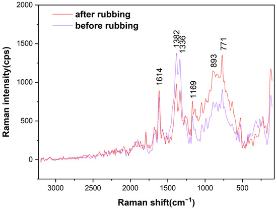 Figure 8 shows the Raman spectra of the PI film before and after liquid crystal lubrication testing under the same conditions as in Load of 25 N Section. The peak positions did not shift after friction, indicating that the molecular structure of the PI film was not significantly affected by friction. However, the intensity of the aromatic ring characteristic peaks (C=C stretching vibration at 1614 cm−1 and C-H bending vibration at 1169 cm−1) increased after friction, while the intensity of the imide characteristic peaks (C-N stretching vibration at 1382 cm−1 and C-H bending vibration at 1336 cm−1) decreased. This may be due to the adsorption of lubricant molecules on the wear scar of the PI film, altering the interfacial structure of the friction system.