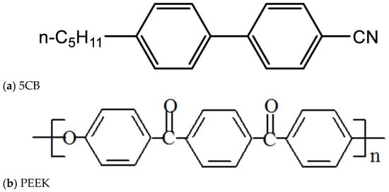 The liquid crystal used as the lubricant in the tests is 4′-pentyl-4-cyanobiphenyl (5CB), purchased from McLin. The GCr15 bearing steel balls (diameter 4.76 mm) were produced by NSK. The PEEK substrate was produced by Guangzhou Tusheng Plastic Products Co., Ltd. (Guangzhou, China) The polyamide acid (PAA) used was sourced from Dalian Jiasheng New Materials Co., Ltd. (Dalian, China). The molecular structures of the materials are shown in Scheme 1.