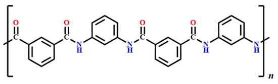 Poly (m-phenylene isophthalamide) (Nomex)-based nonwoven fabrics were obtained from DuPont (Wilmington, DE, USA) through Egypt-Tex Company (Cairo, Egypt) and were characterized in accordance with international standards. The molecular structure of Nomex, shown in Figure 1, illustrated its composition as poly (m-phenylene isophthalamide), which contributes to its exceptional thermal stability and mechanical properties. The mass per unit area (weight) of the textile fabric materials was measured using the Standard Test Method ASTM D3776/D3776M-20 [23]. Fabric thickness was evaluated according to the Standard Test Method ASTM D1777-96(2019) [24]. The air permeability of the fabric was determined using the Standard Test Method ASTM D737-04 [25] with a Toyoseiki (JIKA) air permeability tester (Toyoseiki Co., Ltd., Tokyo, Japan). The general characteristics of the used Nomex fabric were as follows: weight: 926–1083 g/m2, thickness: 4.40–4.80 mm, and air permeability: 0.498–7.680 L/m2.s.