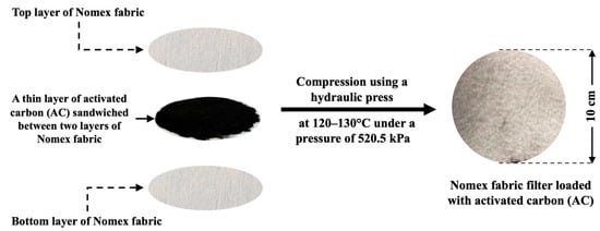 The preparation process of the Nomex/AC filters is illustrated in Figure 2. Different masses of activated carbon (250, 500, 750, and 1000 mg) were evenly distributed between two layers of nonwoven Nomex fabrics, each with a diameter of 10 cm. The sandwich filter was heated for 15 min at a temperature of 120–130 °C and a pressure of 520.5 kPa using a hydraulic press.