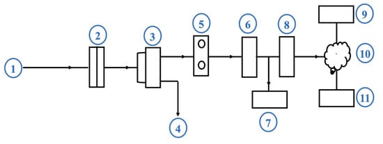 Figure 3. Schematic diagram of the apparatus for sampling and measuring combustion emissions. Components: (1) gas inlet; (2) filter sample holder; (3) differential pressure gauge/vacuum pump; (4) gas outlet; (5) CO2 sensor module; (6) sensor interface; (7) digital detector; (8) gateway (Ethernet/GPRS/WIFI); (9) local server; (10) cloud; (11) mobile phone.