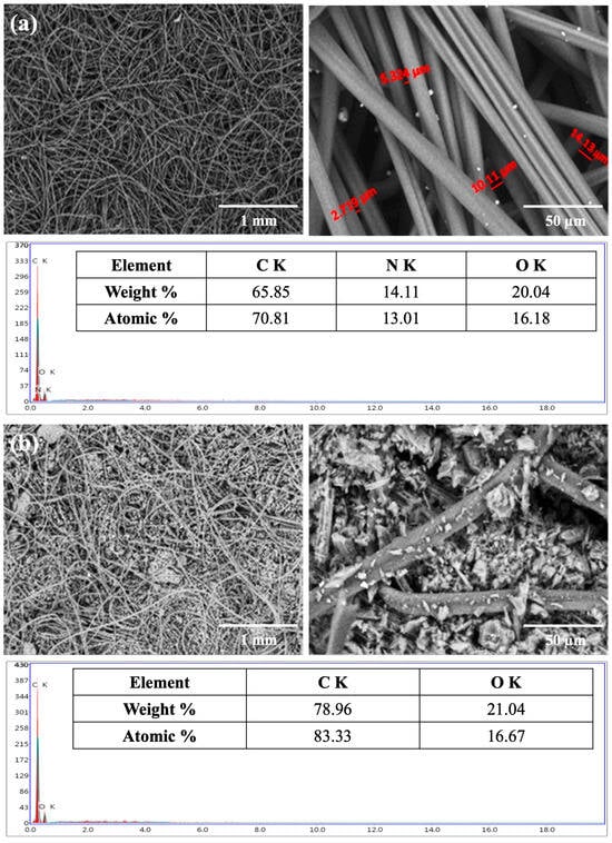 EDX elemental examination revealed that the dominant elemental composition of the surface of the Nomex fabric (the blank) before the addition of activated carbon (Figure 4a) was carbon (70.81%), nitrogen (13.01%), and oxygen (16.18%), which was close to the constituents of Nomex: carbon (70.58%), nitrogen (11.76%), and oxygen (13.44%). After the addition of activated carbon to the Nomex filter, EDX showed (Figure 4b) the presence of only carbon with a higher percentage (83.33%) and oxygen (16.67%). The absence of nitrogen was attributed to the complete and homogeneous coverage of the fabric surface of the filter with the activated carbon.