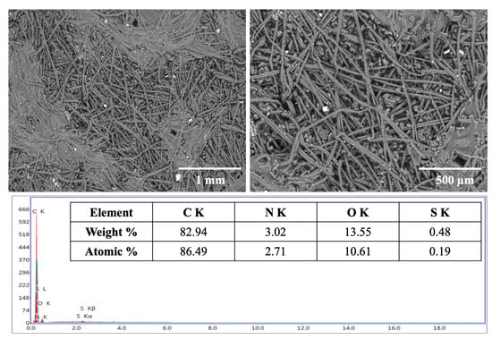 Comparing the surface composition of the sandwich filter before and after CO2 filtration revealed an increase in carbon and the appearance of nitrogen and sulfur peaks. EDX showed (Figure 5) the presence of carbon (86.49%), oxygen (10.61%), nitrogen (2.71%), and sulfur (0.19%). Nitrogen and sulfur originated from nitrogen and sulfur oxides released during gasoline combustion and their subsequent retention on the carbon filter. The white patches visible in the SEM image are attributed to these retained combustion products, particularly NOx and SOx species, as well as possible particulate matter that agglomerates on the filter surface. These species tend to form localized accumulations at high-adsorption sites, appearing as bright regions due to their different atomic contrast in SEM imaging. The accompanying EDX spectrum and composition table confirm this interpretation, and the presence of nitrogen and sulfur, not originally detected in the pre-filtration filter, further supports their origin from engine exhaust gases.