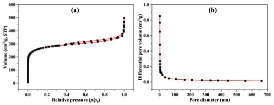 Figure 6. (a) N2 adsorption–desorption isotherms of AC; (b) the corresponding pore size distribution.