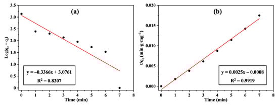 where qe and qt are the adsorption capacities (mg·g−1) of the adsorbent at equilibrium and at any time, respectively. t represents the contact time (min), while k1 (min−1) and k2 (g·mg−1·min−1) are the rate constants of the pseudo-first-order and pseudo-second-order adsorption models, respectively.